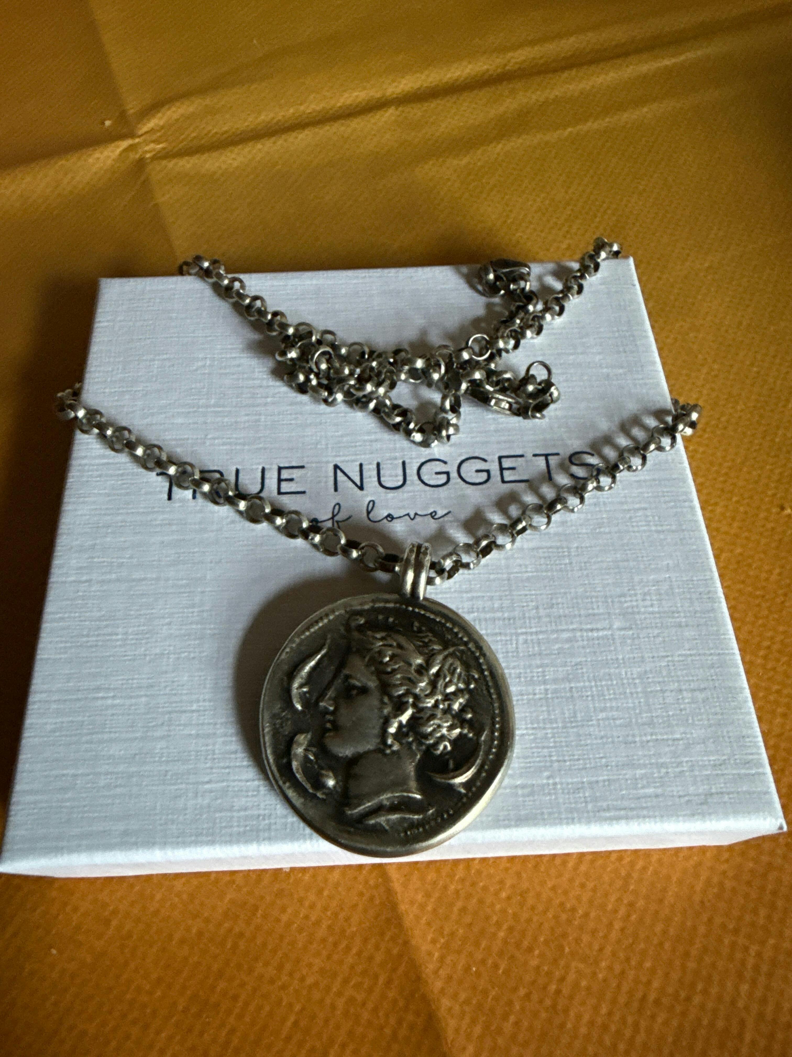 Kleiner Blick auf die große Kette mit Münzanhänger Arethusa unser größten Münze aus Sterling Silber von True Nuggets